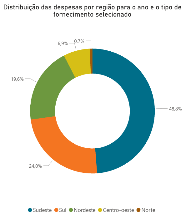 Também é possível verificar que a região Sudeste do Brasil foi a região para a qual os planos de saúde forneceram a maior quantidade de medicamentos em 2024, o que pode ser explicado pelo fato de que é a região com maior disponibilidade de médicos, consultórios e hospitais. Os percentuais de cada região são os seguintes: